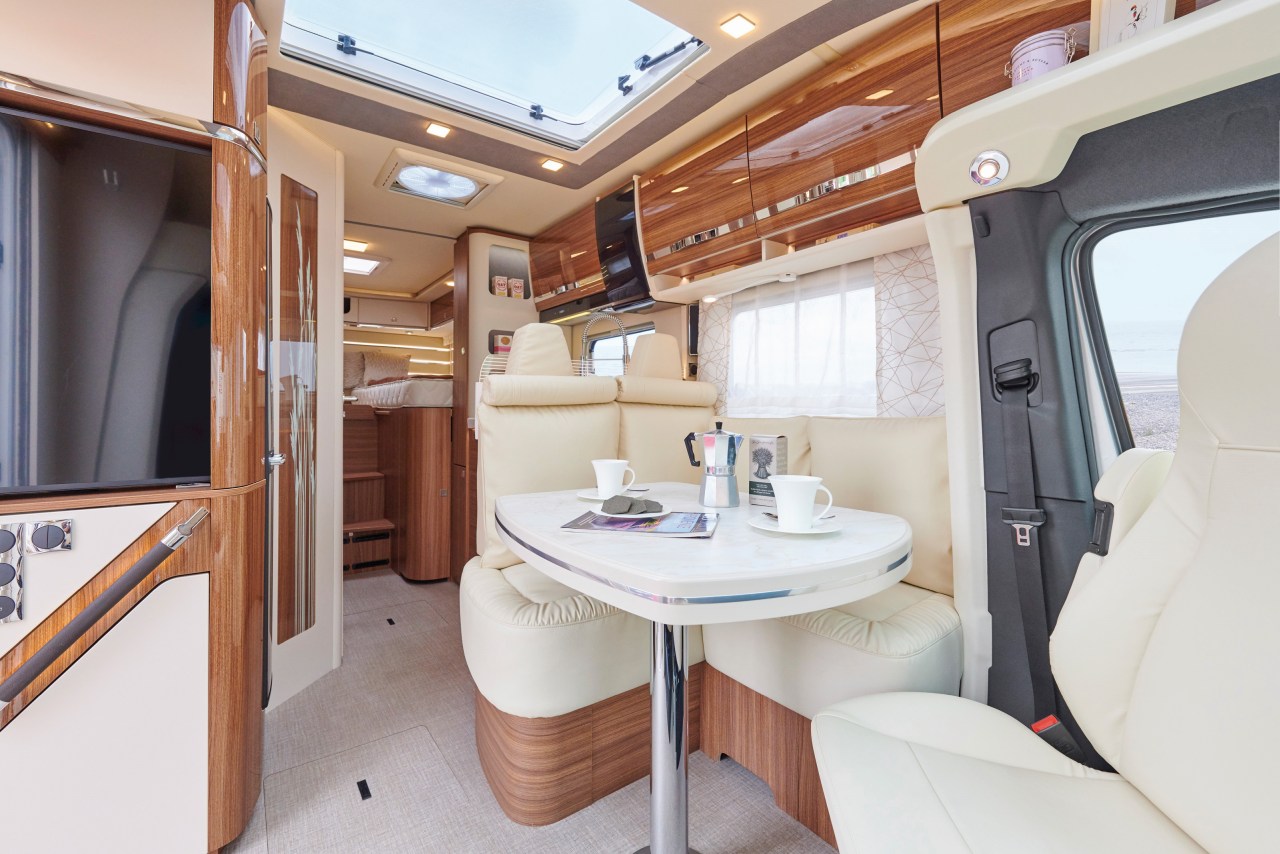 Geräumiges teilintegriertes Wohnmobil der Luxusklasse mit 6-Gang-Schaltgetriebe, Fahrerhaus-Klimaanlage, Radio, TV/Sat, Wohnraum-Klimaanlage, seitlicher Küche mit Kühlschrank, Nasszelle mit Toilette, separate Duschmöglichkeit. Sitzmöglichkeit für vier und Schlafmöglichkeit für zwei Personen. Die Schlafmöglichkeiten befinden sich in den beiden im Heck eingebauten Einzelbetten, die zu einem Doppelbett umgebaut werden können.