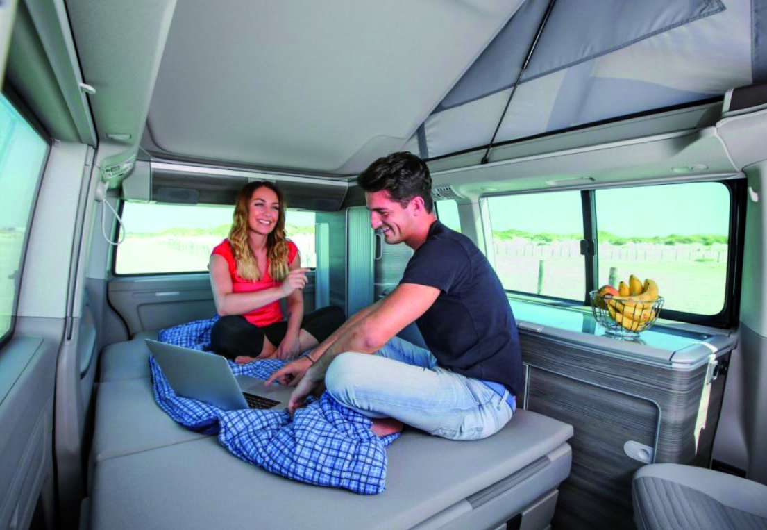 Komfortabler und kompakter Campingbus mit elektrischem Aufstelldach, 7-Gang-Automatikgetriebe, Fahrerhaus-Klimaanlage, Radio/ Navigation, kleiner Küche mit Kühlbox, Außendusche, Sitzmöglichkeit für vier Personen und Schlafmöglichkeit für vier Personen (zwei im Aufstelldach).
