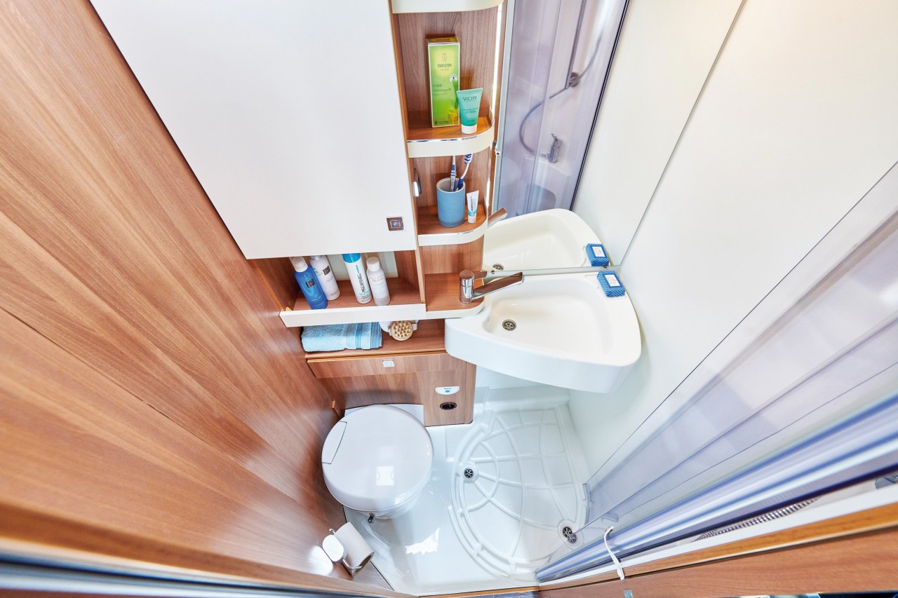 Badraum mit Chemie-Toilette und integrierter Dusche