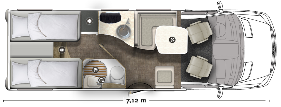 Sehr komfortables teilintegriertes Wohnmobil mit Automatikgetriebe, Fahrerhaus-Klimaanlage, Radio, Wohnraum-Klimaanlage, seitlicher Küche mit Kühlschrank, Nasszelle mit Toilette und Duschmöglichkeit. Sitzmöglichkeit für vier Personen und Schlafmöglichkeit für vier Personen. Zwei Schlafmöglichkeiten befinden sich in den beiden im Heck eingebauten Einzelbetten, zwei weitere Betten werden durch Umbau der Sitzgruppe hergestellt.
