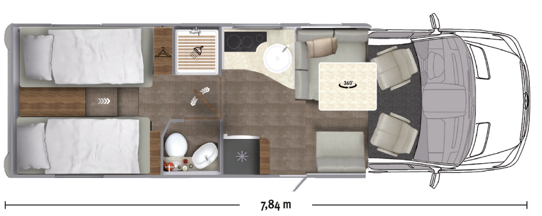 Geräumiges teilintegriertes Wohnmobil der Luxusklasse mit 6-Gang-Schaltgetriebe, Fahrerhaus-Klimaanlage, Radio, TV/Sat, Wohnraum-Klimaanlage, seitlicher Küche mit Kühlschrank, Nasszelle mit Toilette, separate Duschmöglichkeit. Sitzmöglichkeit für vier und Schlafmöglichkeit für zwei Personen. Die Schlafmöglichkeiten befinden sich in den beiden im Heck eingebauten Einzelbetten, die zu einem Doppelbett umgebaut werden können.